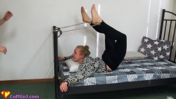 Hannah is not only curious but also very flexible, especially in her lower back! So I tested her using a chain to hoist her up, in a hogcuffed position. Do NOT try this at home! Hannah is extremely flexible and she can handle it, but cuffs are not made for this (they are too sharp). Maybe I can find some more comfortable cuffs for Hannah and keep her in this position for a long time!